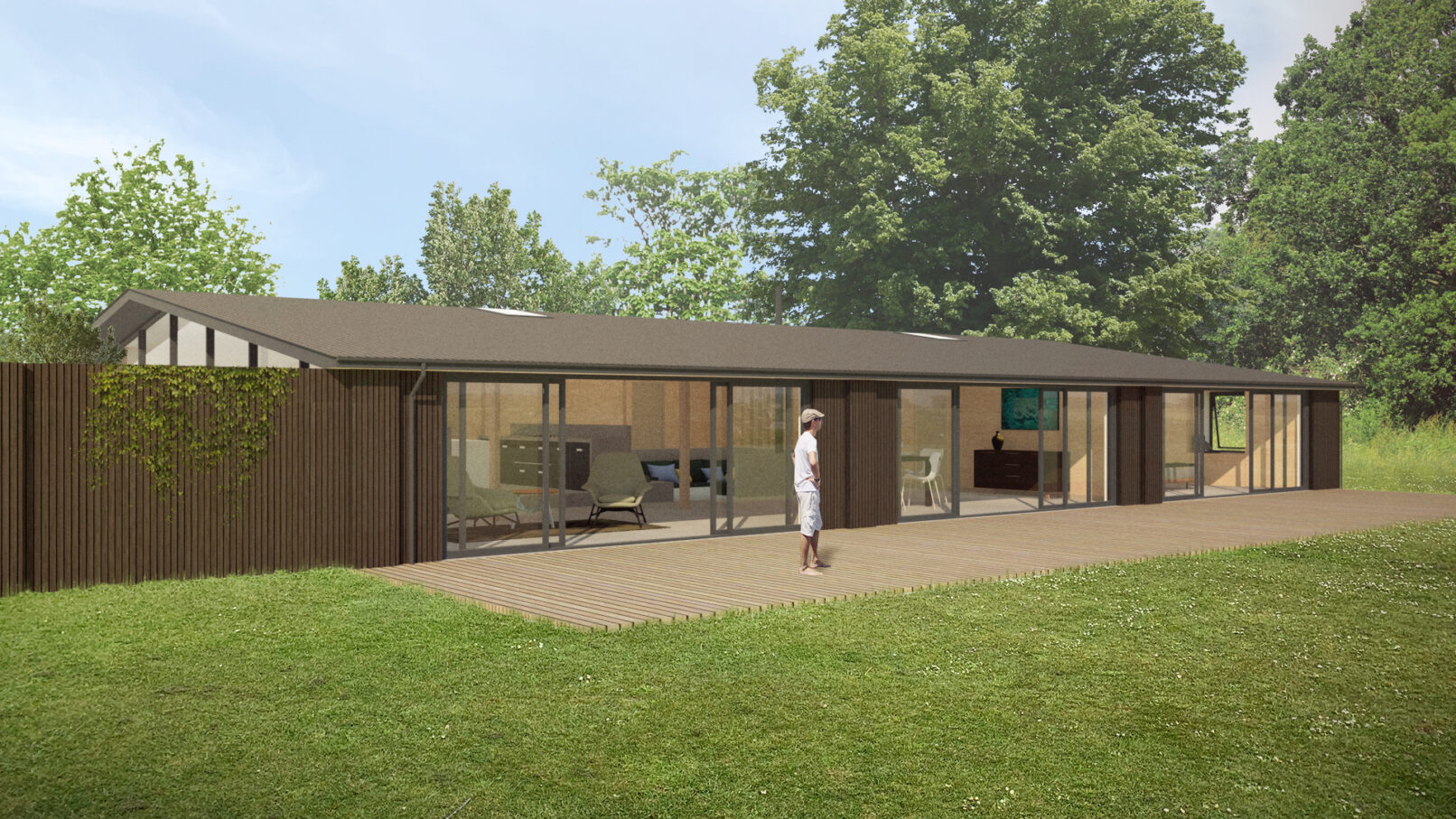 Externally, the building is finished with a restrained palette of materials, including vertical timber cladding and a standing seam metal roof, enhancing the clean lines and understated character of the home.