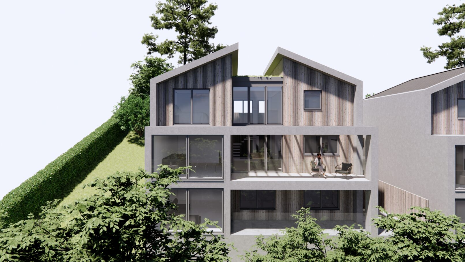 The resulting proposals are for a pair of detached, 3 storey 4/5 bed houses, positioned to avoid the root protection areas retained trees. Only the top storey is visible from the lane to the west, from which a bridge driveway provides access to the top floor garage. Views are afforded to the north and south from screened balconies, while overlooking is addressed with retained and enhanced planting to the eastern boundary.