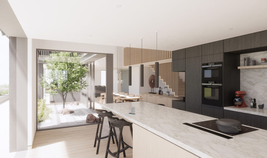 Our approach was to create a garage and covered car port at the northern end of the building, then arrange the principal living spaces along the eastern and southern sides at ground floor. An inset courtyard off the dining space helps screen the lounge from the kitchen and also brings light into all three of those spaces. Beyond this is a snug, ground floor ensuite bedroom, study and utility.
